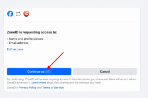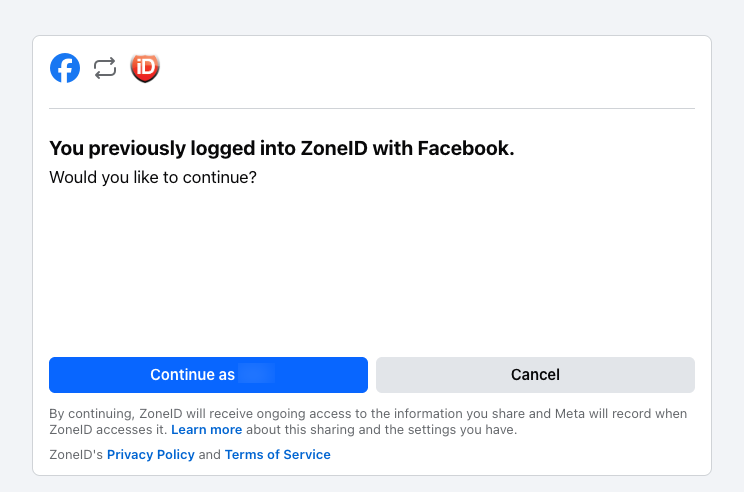 Seuraavaksi näytetään tiedot Facebook-tilistäsi ja siihen liitetyistä ZoneID-tileistä. Jos tähän Facebook-tiliin on linkitetty useita ZoneID-tilejä, voit valita haluamasi tilit avattavasta valikosta. Napsauta sitten Continue as ....