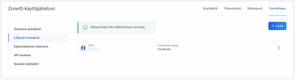 Identiteetti linkitetään tiliin ja lisätään siihen liittyvien identiteettien luetteloon.