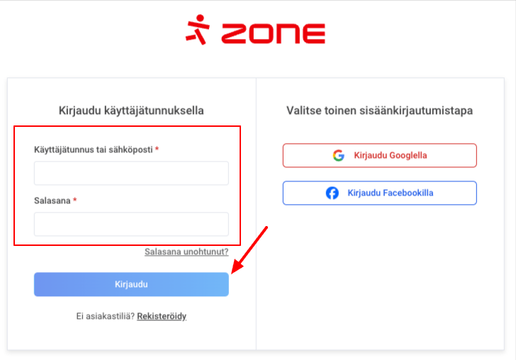 Kirjaudu sisään salasanalla valitsemalla  Asiakastili  Zone kotisivun oikeasta yläkulmasta. Kirjautumissivu avautuu, ja Salasana on oletusarvoinen kirjautumisvaihtoehto.