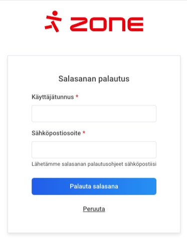 Syötä ZoneID-käyttäjätunnuksesi ja tilillesi määritetty yhteyssähköpostiosoite. Tämän jälkeen salasanan palautusohjeet lähetetään sähköpostiisi.