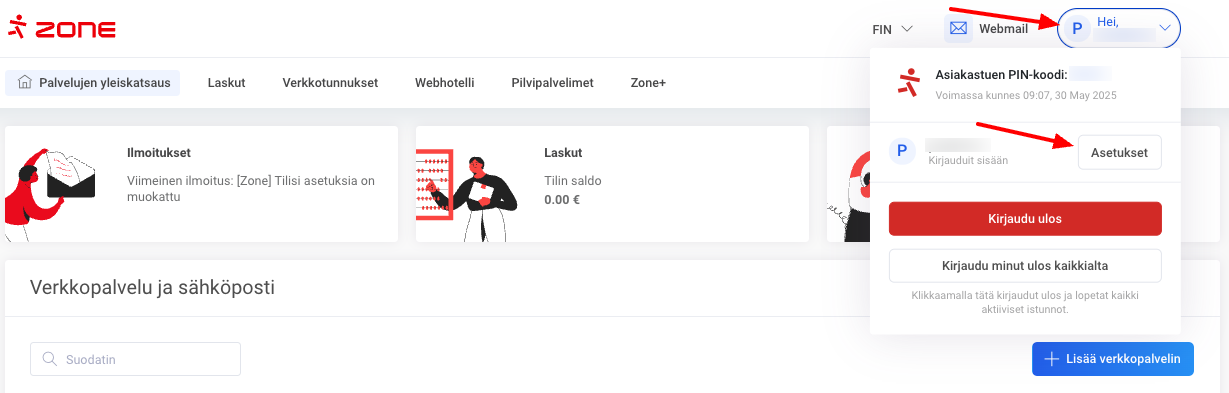Lisäyhteystietoja voi määrittää My Zone hallintapaneelissa valitsemalla tilin nimen alta Asetukset.