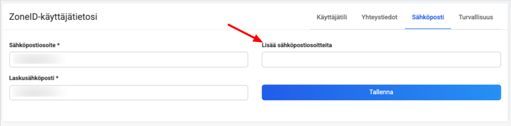 Lisäsähköpostiosoitteen lisääminen ZoneID-tilille tarkoittaa, että verkkopalvelun ylläpitäjälle tai kehittäjälle voidaan määrittää ylimääräinen sähköpostiosoite asiakastilille, jolloin he saavat kopion kaikista palveluun liittyvistä ilmoituksista.