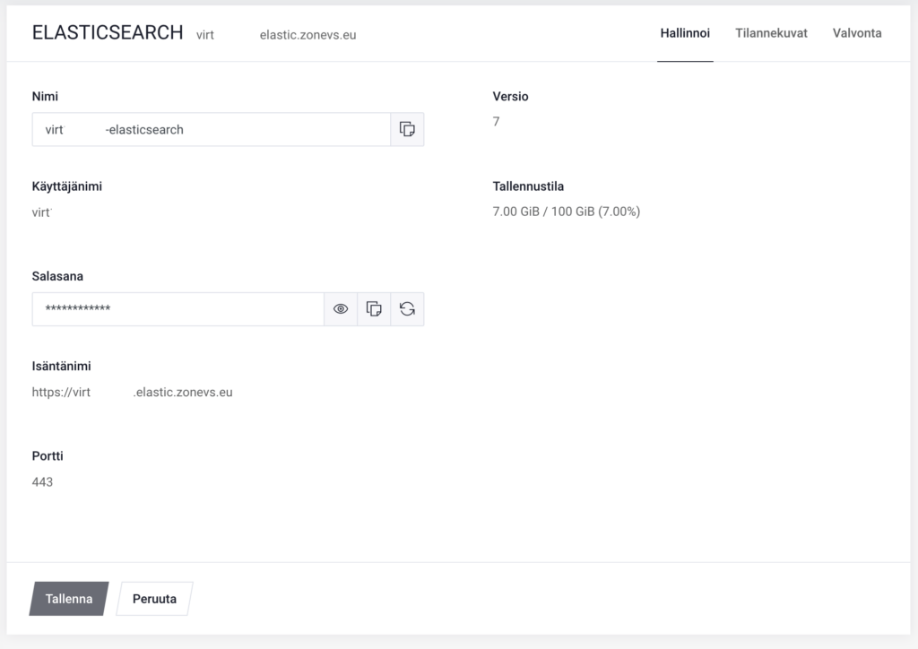 Hostname ja Username määrityksissä XXX on korvattava numerolla, joka näkyy Elasticsearch-instanssia lisättäessä.