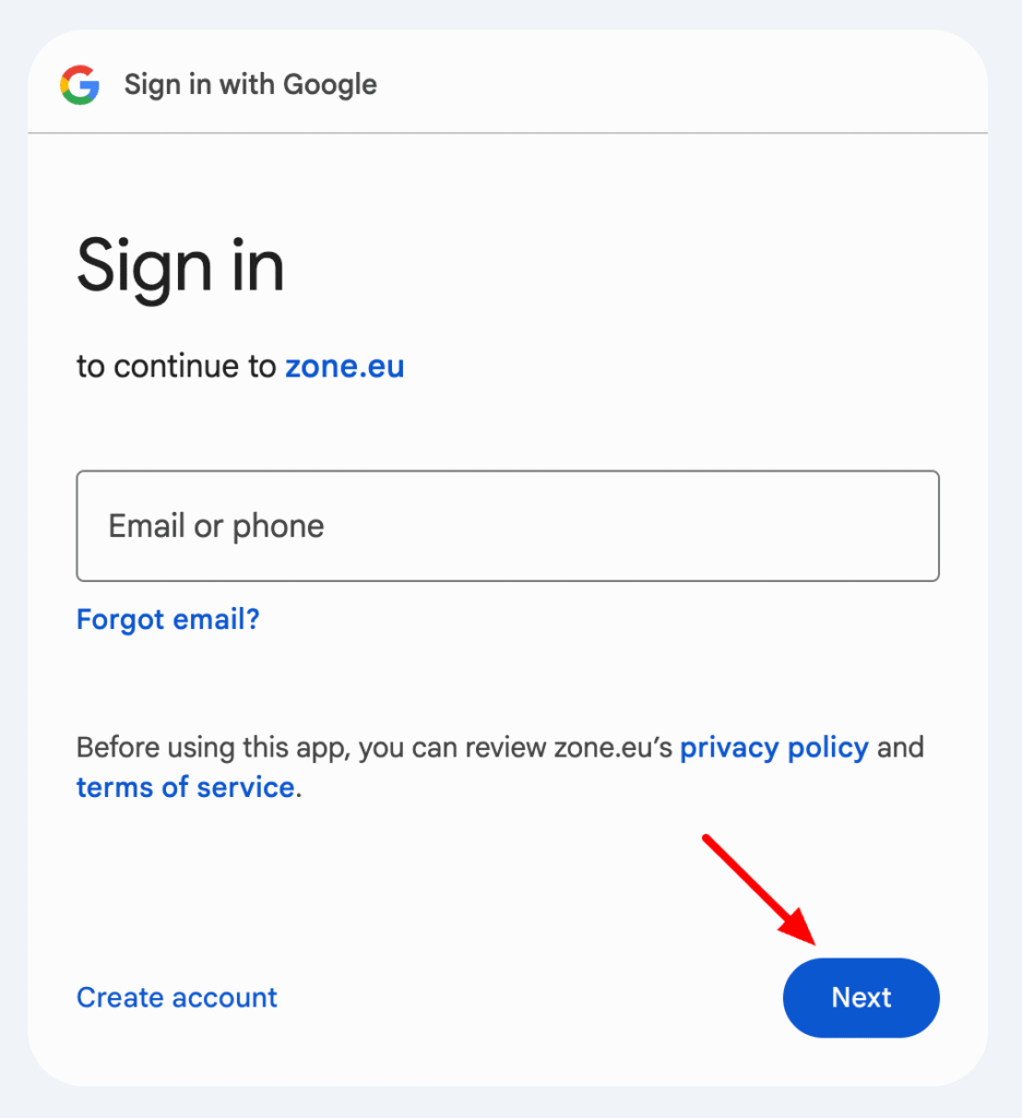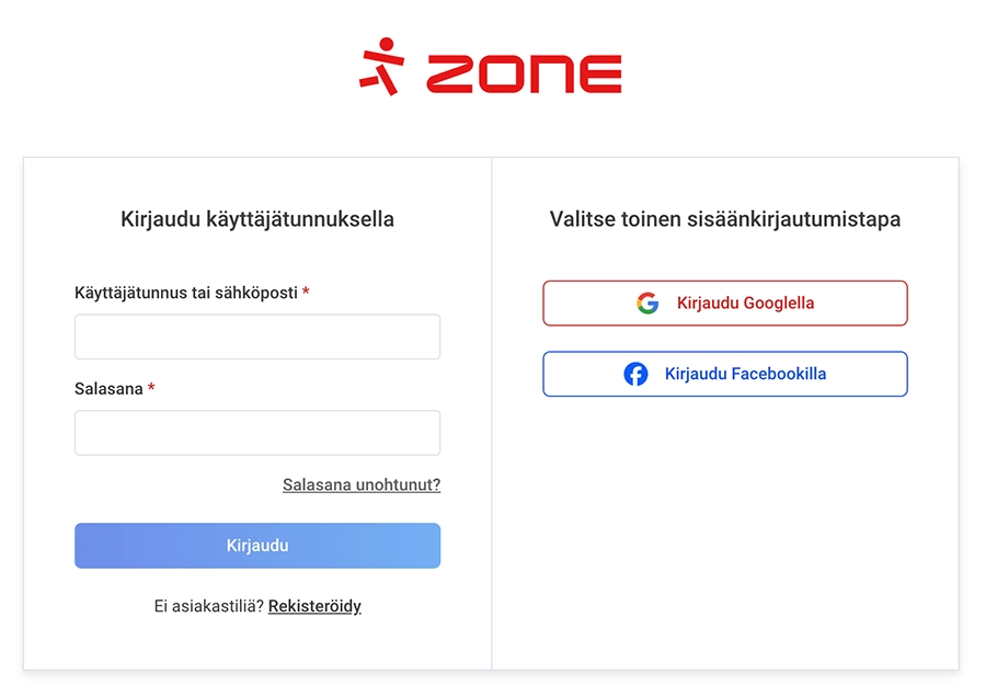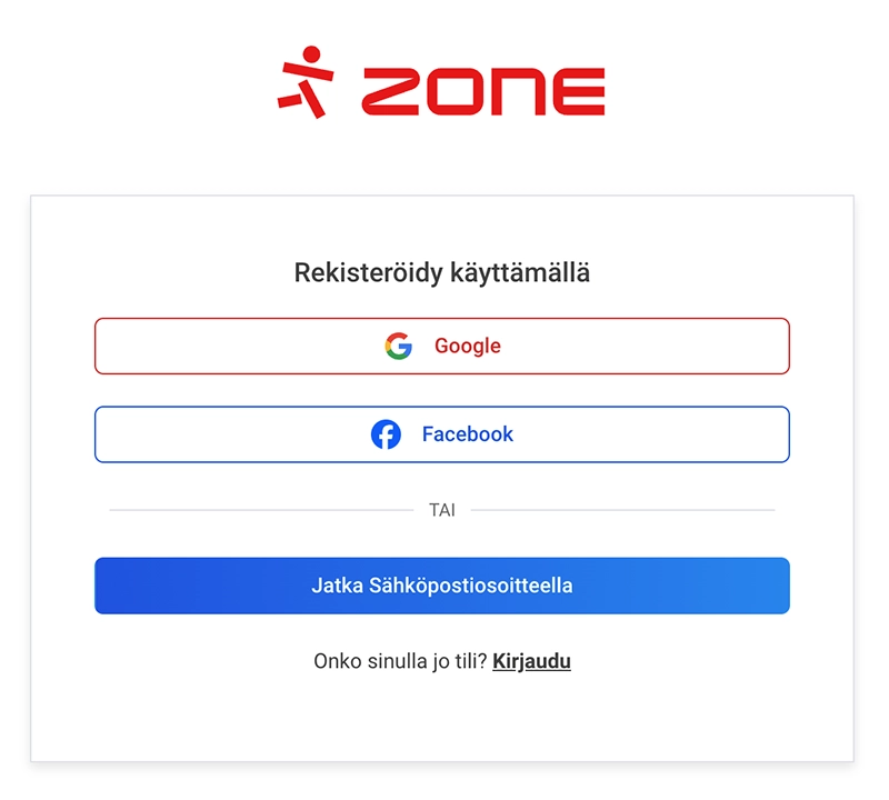 Kun luot ZoneID-tilin, voit välittömästi linkittää tilisi Google- tai Facebook-tiliisi. Tässä tapauksessa ZoneID-tilille ei määritetä salasanaa, ja kirjautuminen on mahdollista vain tämän vaihtoehdon kautta. Muita todennusmenetelmiä voidaan lisätä myöhemmin My Zone -hallintapaneelissa.