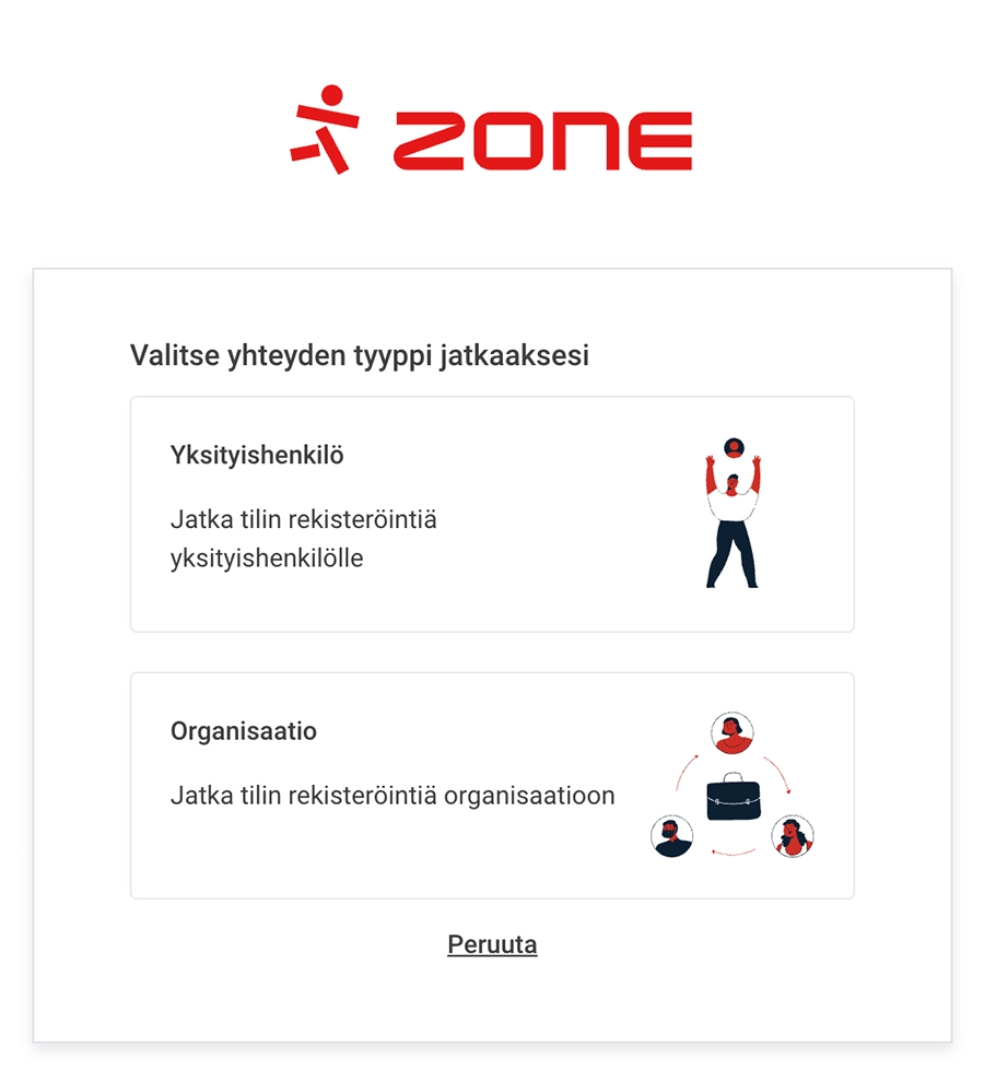Valitse seuraavaksi rekisteröitkö tilin yksityishenkilön tai organisaation nimiin. Se riippuu siitä, kenen nimellä haluat vastaanottaa laskuja palveluista. Laskut laitetaan aina ZoneID-tilin omistajalle.