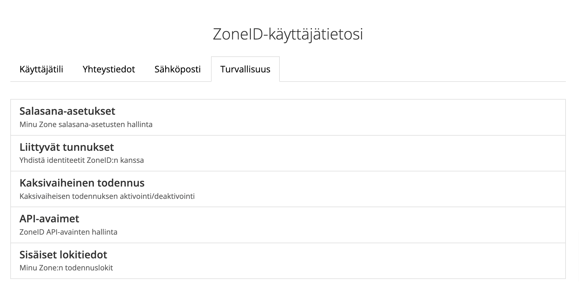 Turvallisuus-osiossa voit vaihtaa ZoneID-tilisi salasanan, yhdistää ja hallita todennustyökaluja, hallita API-avaimia ja tarkistaa My Zone Sisäiset lokitiedot.