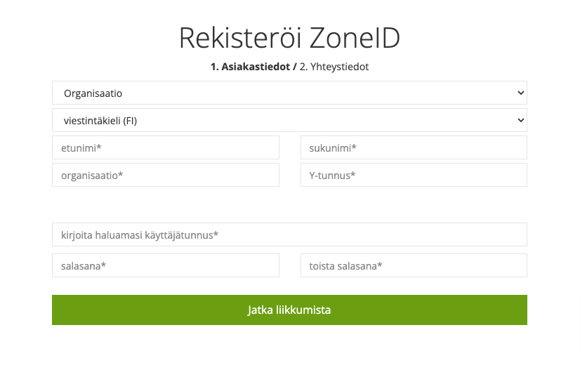 Valitse haluamasi viestintäkieli ja täytä kaikki sivun kentät. Organisaatio sivulla on kaksi lisäkenttää: Organisaatio ja Y-tunnus. Pakolliset kentät ovat aina merkitty tähtimerkillä *.