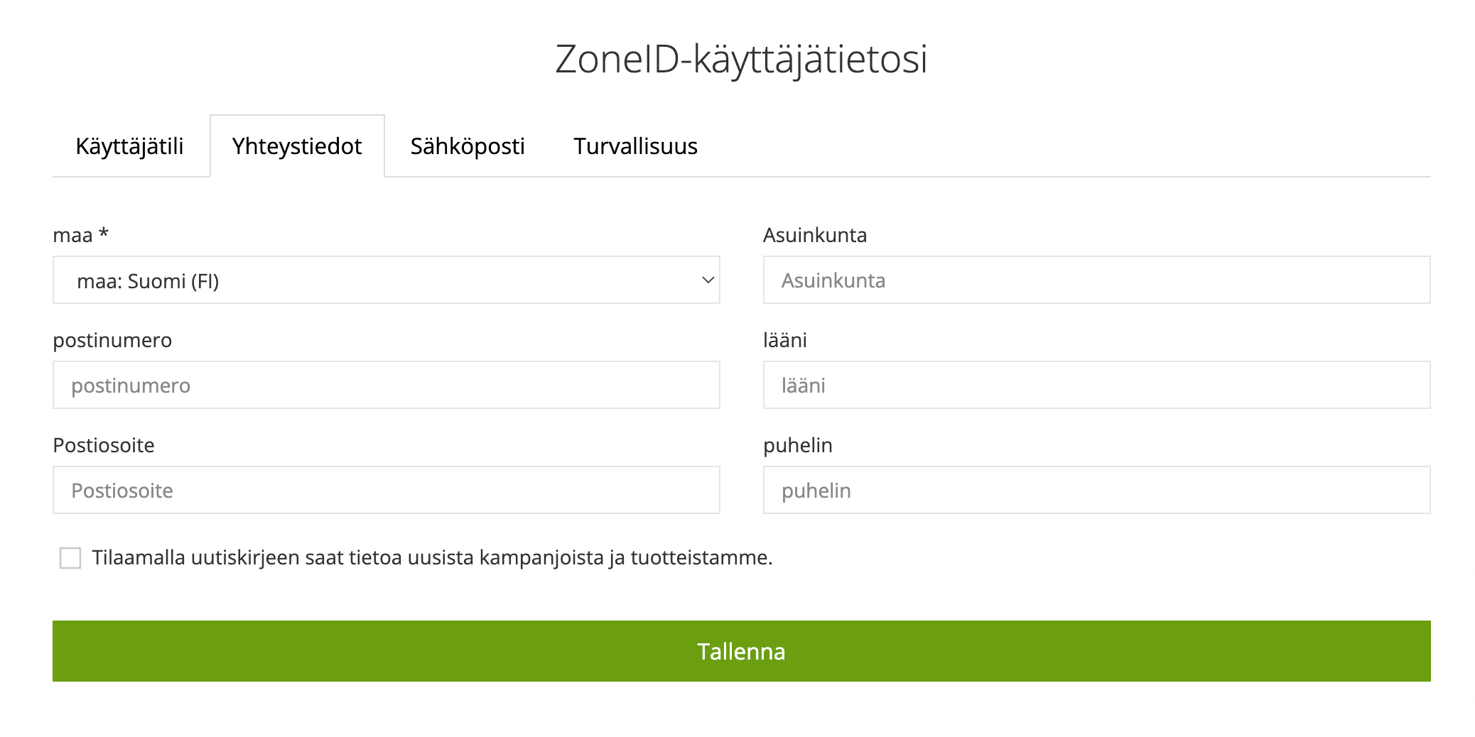 Yhteystietoja annettaessa ainoat pakolliset kentät ovat Puhelinnumero, Postiosoite ja Postinumero.