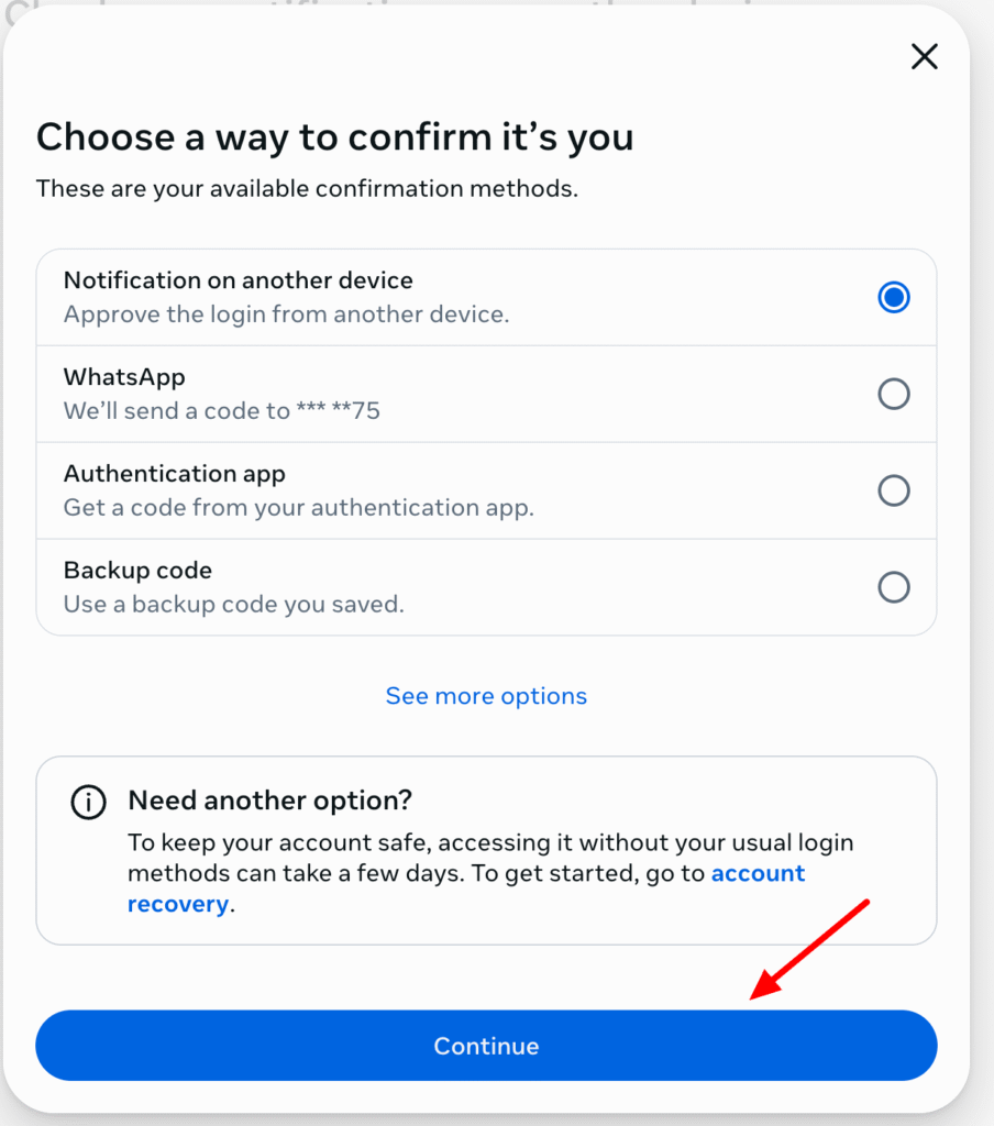 Jos kaksivaiheinen tunnistautuminen (2FA) on aktivoitu Facebook-tililläsi, sinun on lisäksi vahvistettava kirjautumisesi toisella laitteella tai valittava toinen vahvistusmenetelmä.