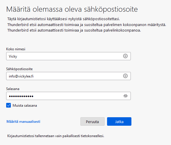 Tarkista tässä ikkunassa, että tilitiedot ovat seuraavat:
