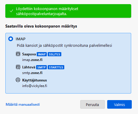 Seuraavat sähköpostiasetukset sopivat sähköpostitilillesi: