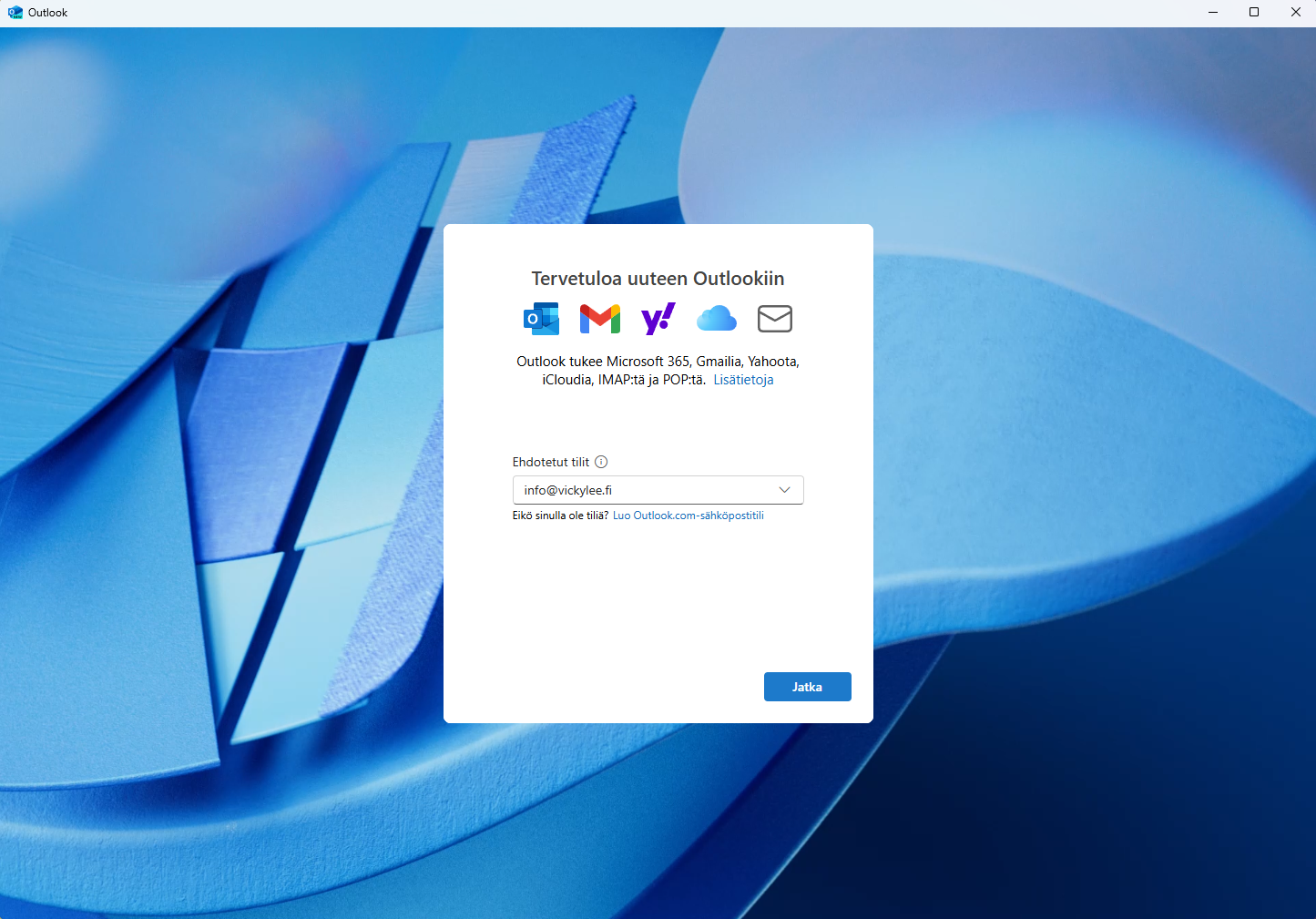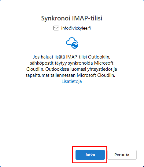 Microsoft kysyy nyt, haluatko synkronoida sähköpostitilisi heidän pilvensä kanssa. Napsauta Jatka ja tili yhdistetään.