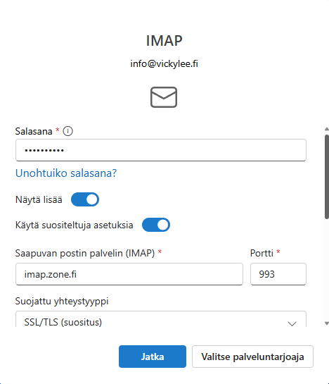 - Saapuvan sähköpostin IMAP-palvelin: imap.zone.fi portti 993