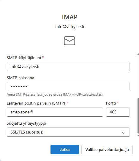 - Lähtevän sähköpostin SMTP-palvelin: smtp.zone.fi portti 465 tai 587