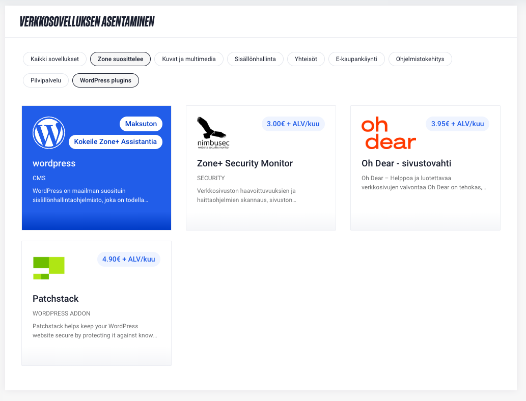 Jos WordPress-sovellus on asennettu manuaalisesti eikä se näy Zone+:ssa, sen voi tuoda Zone+:n hallintaan. Tähän on kaksi vaihtoehtoa: