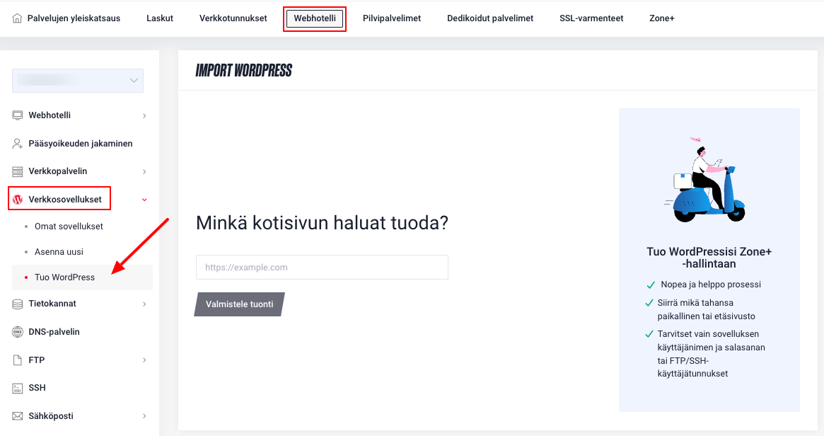 Webhotelli, sen jälkeen vasemmasta valikostaVerkkosovelluksetja klikkaamallaTuo WordPress.