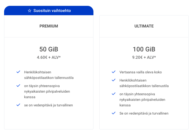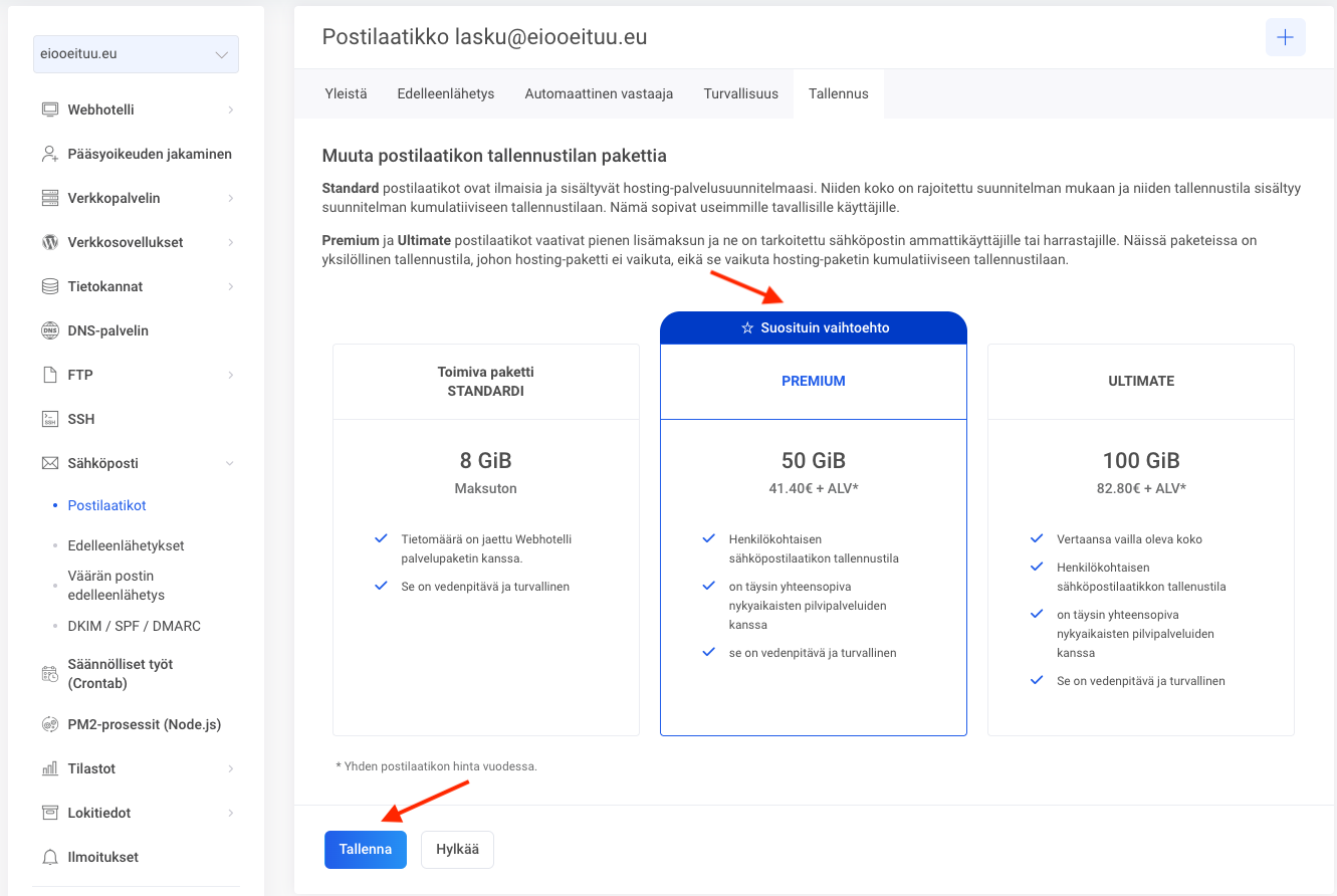 Valitse Premium ja Ultimate sähköpostipaketin luettelosta sopiva paketti ja klikkaa Tallenna. Pakettia vastaavat sähköpostitilin resurssit otetaan käyttöön heti, kun muutokset on tallennettu. Sieltä voit jo valita itsellesi sopivimman paketin. Laskutus alkaa automaattisesti.
