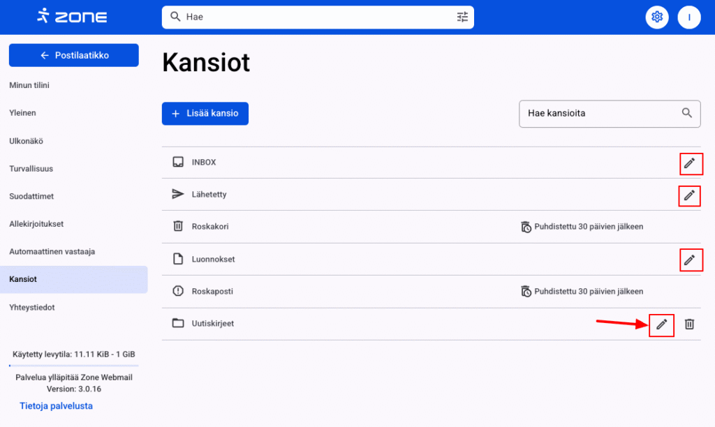 Sähköpostien automaattinen poistaminen Webmail-kansioista on mahdollista määrittää Zone Webmailissa tietyn ajan kuluttua.