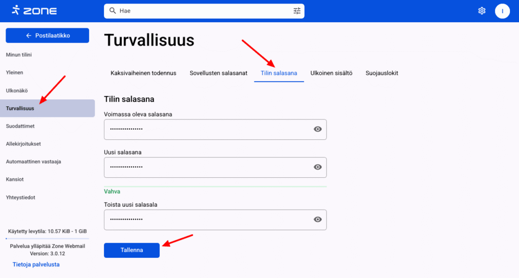 Kirjoita nykyinen salasana ja uusi salasana kahdesti ja napsauta Tallenna