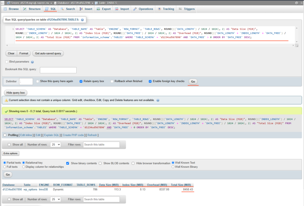 On nähtävissä, että tämän WordPressin optiotaulukon koko on 113,3 MiB, mutta vapauttamattoman tilan alla on jumissa 8337 MiB tai 8,1 GiB – se on yli 70 kertaa taulukon datan kokoa!