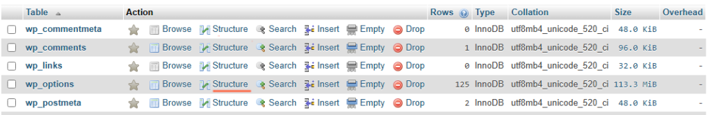 Kun olet kirjautunut phpMyAdminiin, valitse vasemmasta sarakkeesta haluamasi tietokanta, jonka kaikki taulukot näkyvät ensimmäisellä Structure