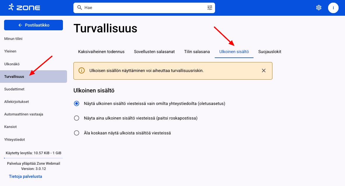 Valitse Turvallisuus ja Ulkoinen sisältö.