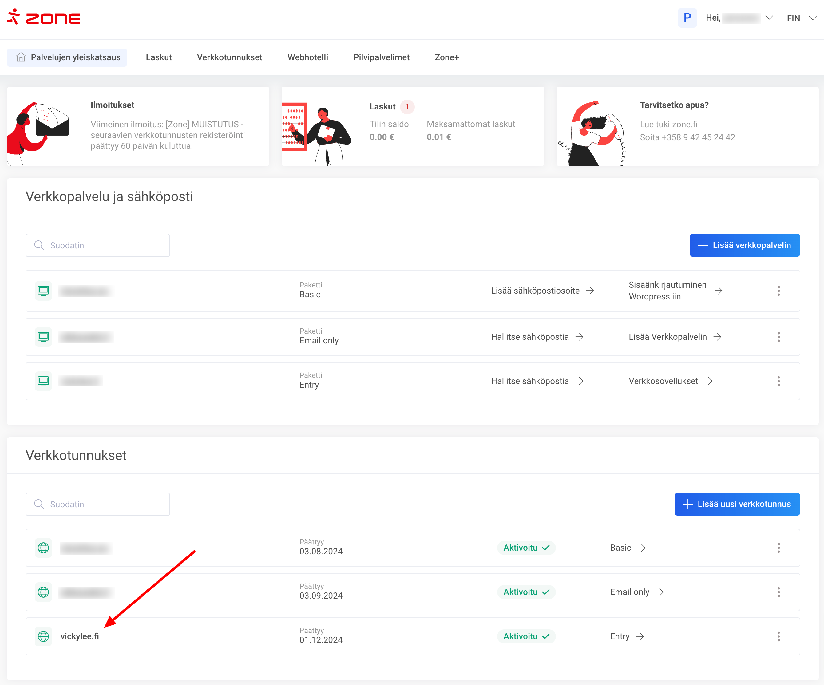 Zone:ssa rekisteröidyn verkkotunnuksen nimipalvelimien vaihtaminen käy My Zone -ohjauspaneelista napsauttamalla verkkotunnuksesi nimeä Palvelujen yleiskatsauksen sivulla.