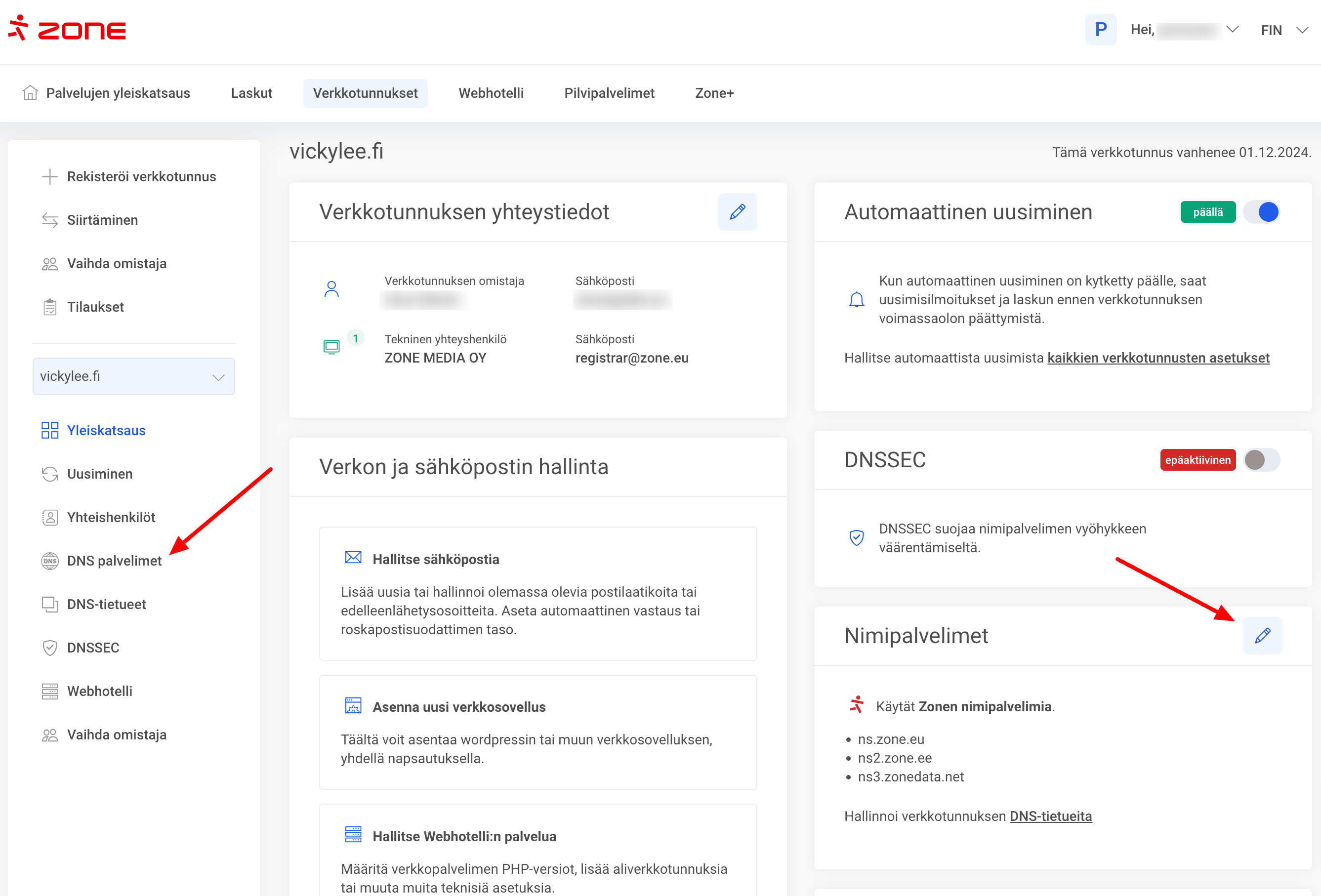 Seuraavalla sivulla valitse DNS palvelimet menusta vasemmalta tai napsauta Nimipalvelimet-vaihtoehdon kynäkuvaketta oikealla.