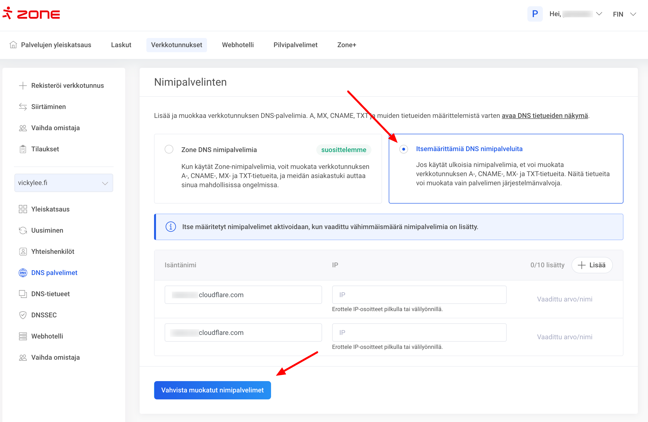 Aktivoi Itsemäärittämiä DNS nimipalveluita -vaihtoehto ja lisää haluamasi nimipalvelimet alla oleviin kenttiin. Syötä jokaisen nimipalvelimen isäntänimi omalle rivilleen ja vahvista muutos.