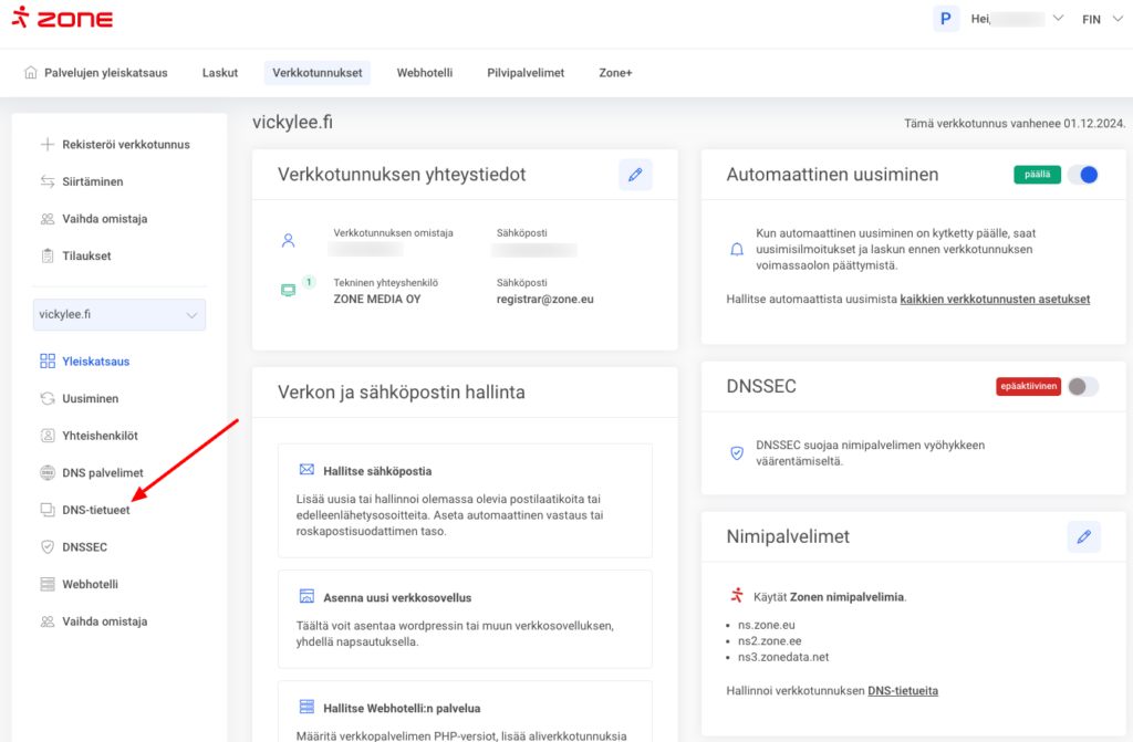 Tietueen lisäämistä varten kirjaudu sisään My Zone -ympäristöön ja napsauta haluamaasi verkkotunnuksen nimeä Palvelujen yleiskatsauksen sivulla.