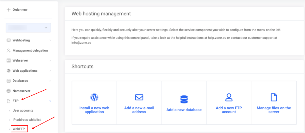 Ensin sinun on siirryttävä FTP-asiakasohjelmaan tai WebFTP-asiakasohjelmaan tiedostojen vaihtamiseksi. Voit vaihtaa tiedostoja helposti My Zone –hallintapaneelin kautta valitsemalla yläreunassa olevan palvelun yleiskuvaussivulta Webhotelli → FTP → WebFTP .