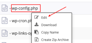 Etsi avautuvasta hakemistosta wp-config.php -tiedosto, napsauta sitä hiiren kakkospainikkeella ja valitse Muokkaa.