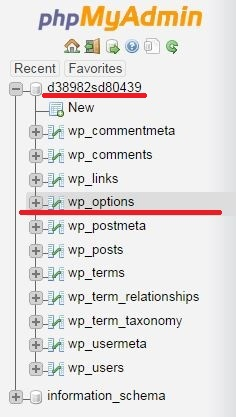 Napsauta phpMyAdmin-paneelissa tietokannan nimeä vasemmassa lohkossa ja valitse avautuvasta vaihtoehdosta wp_options (wp:n sijaan taulukossa voi olla myös eri etuliite).