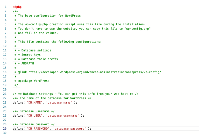 define()-funktioiden väliltä. Käyttäjätunnus muodossa DB_USER ja salasana muodossa DB_PASSWORD, tunnistetiedot erotetaan merkillä ’ ja ”.