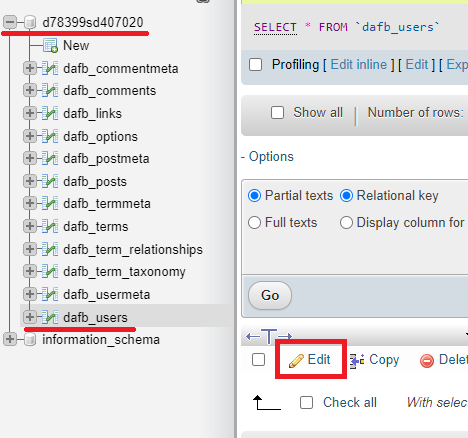 Napsauta phpMyAdmin tietokannan nimeä vasemmassa lohkossa ja valitse sitten wp_users seuraavasta valikosta (taulukoissa voi olla eri etuliite wp:n sijaan). Napsauta järjestelmänvalvojan käyttäjätilirivillä Muokkaa. Jos asensit WordPressin palvelimelle Zone+:n kautta, järjestelmänvalvojan tilin käyttäjätunnus on zoneplus. Jos asennat WordPressin manuaalisesti, tämä voi olla admin.