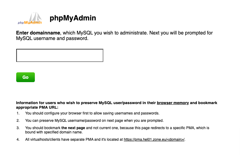 Helpoin tapa muodostaa yhteys tietokantaan on phpMyAdmin-ympäristön kautta. Jos My Zone -hallintapaneeli on vielä auki erillisellä välilehdellä, pääset sieltä phpMyAdmin-ympäristöön valitsemalla vasemmasta webhotellin hallintavalikosta Databases ja sen alta phpMyAdmin. Jos olet jo onnistunut sulkemaan My Zone, suora linkki phpMyAdminiin on: https://pma.hel01.zone.eu/ Kun seuraat suoraa linkkiä, kirjoita ensin verkkotunnuksesi nimi ilman www-etuliitettä (esim. domain.fi) ja napsauta Kirjaudu