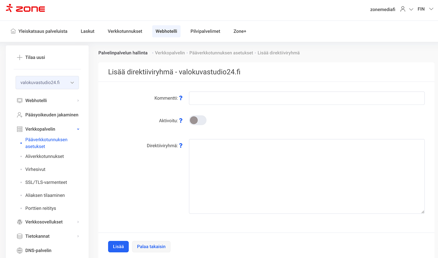 Tämän rajoituksen poistamiseksi sinun on kirjauduttava sisään My Zone-hallintapaneeliin ja web-hosting-hallinnan Webhotelli-osiossa kohdassa Verkkopalvelin-> Pääverkkotunnuksen asetukset -> Muokkaa -> Apache-direktiivit -> Lisä direktiiviryhmä -ikkunassa lisää komentolohko seuraavalla sisällöllä: