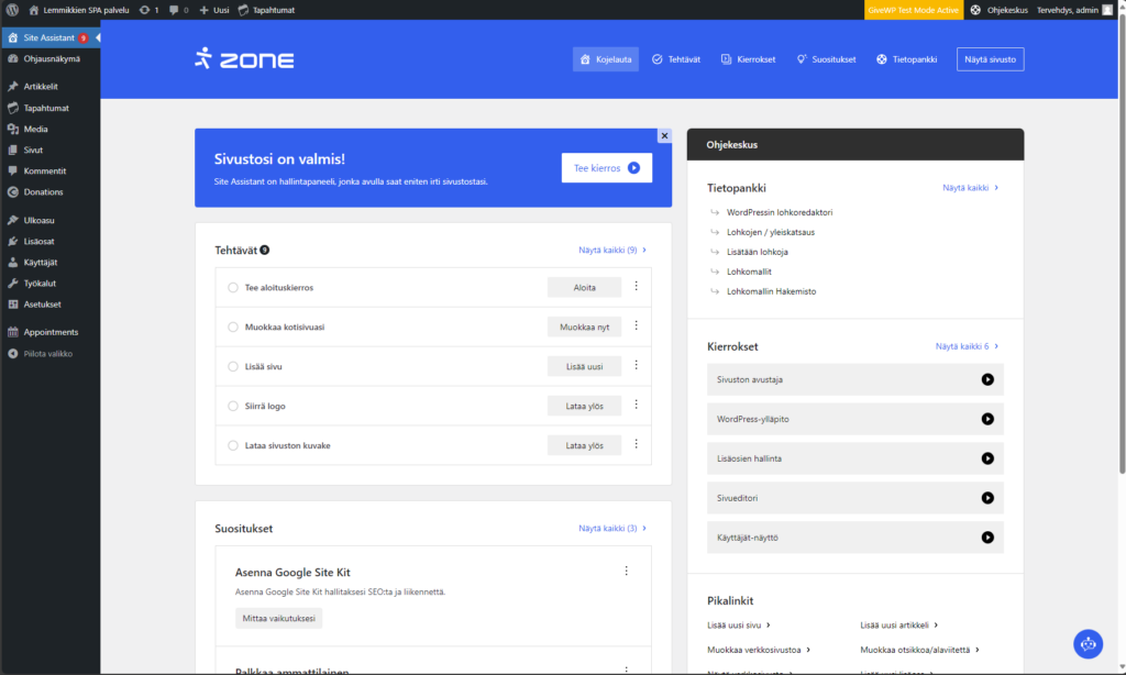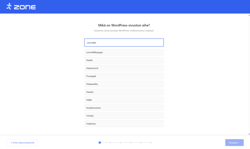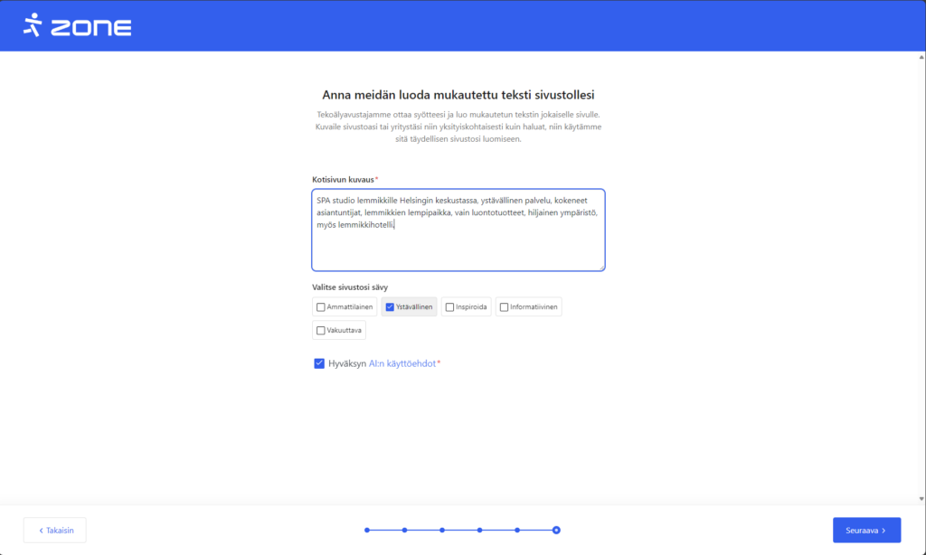 ZonePlus WordPress Assistant on AI:n eli tekoälyn rakentama kotisivu. Avustajan opastuksella tehdään nettisivun luominen mahdollisimman helpoksi: