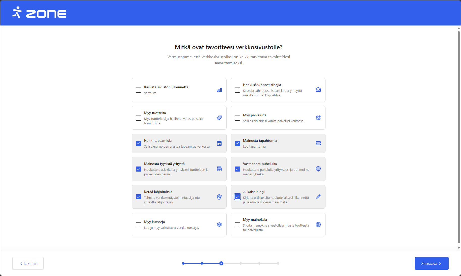 Seuraavaksi valitset kotisivun tavoitteet ja alustavan ulkoasun, jota voit tarvittaessa muokata myöhemmin: