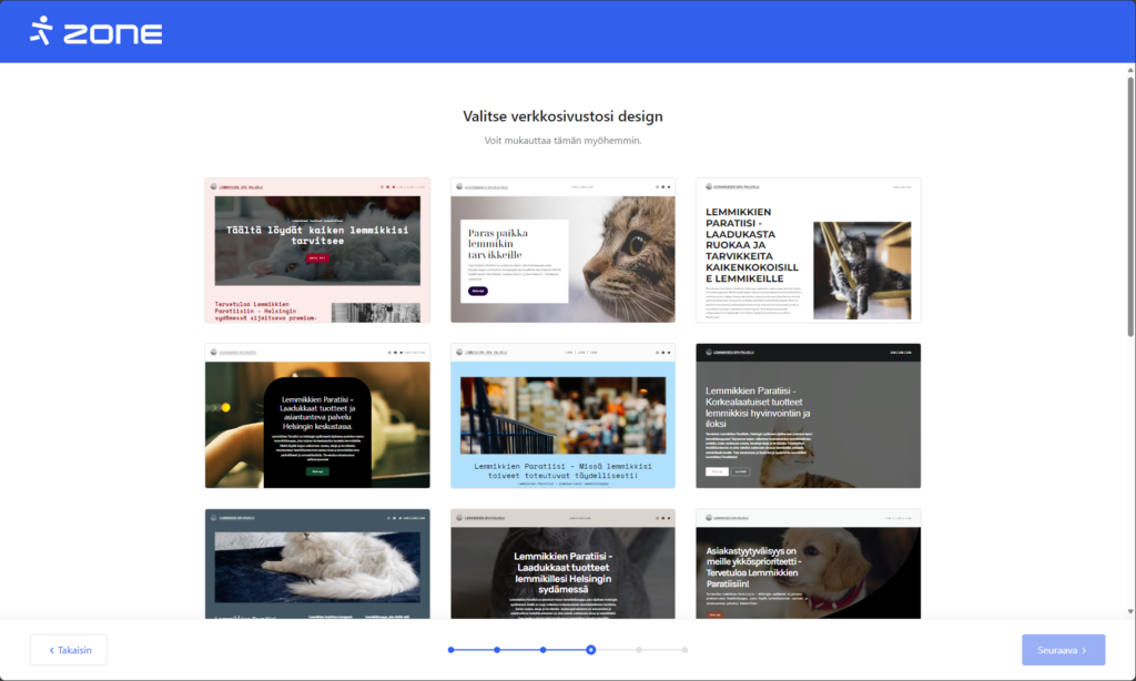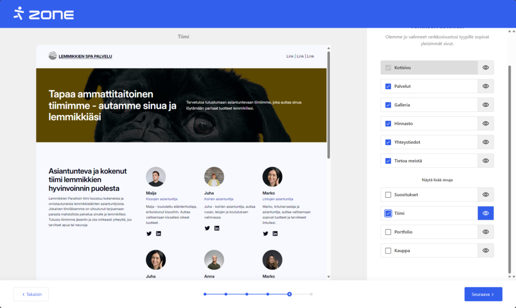 Sovelluksen asentamisen jälkeen voit aloittaa nettisivun luomisen ohjatun toiminnon avulla, mutta ensin sinun on määriteltävä, miltä verkkosivusto näyttää. Tässä esimerkissä käytämme vaihtoehtoa ”Lemmikkien SPA”: