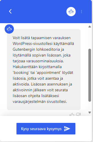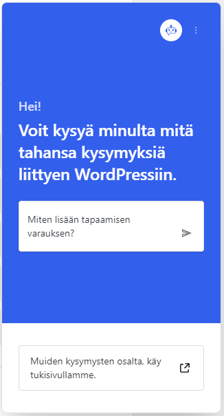 - WordPressin sisällä oleva ”chatbot” – auttaa sinua löytämään vastauksia kysymyksiisi.