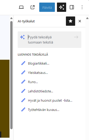 - WordPressin sisäänrakennettu tekstin tekoäly – eli, jos muokkaat sivua, oikeassa yläkulmassa on tekoälykuvake, jonka avulla voit antaa tekoälyn kirjoittaa, muokata, lisätä, lyhentää/laajentaa tekstejä ja paljon muuta: