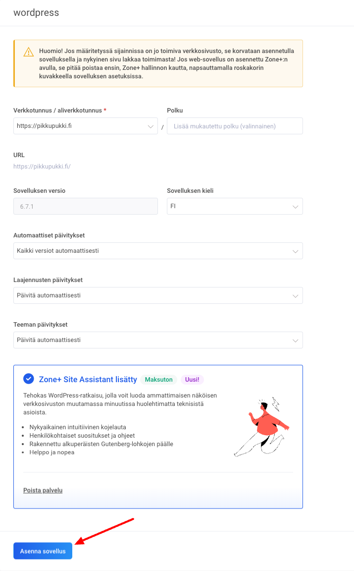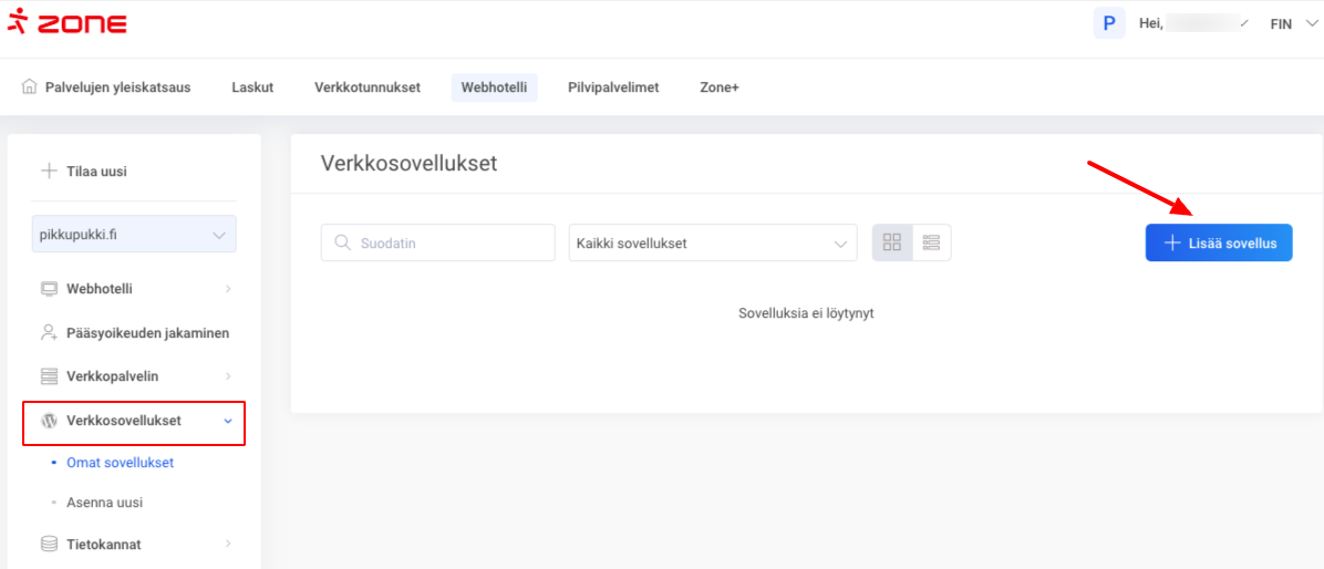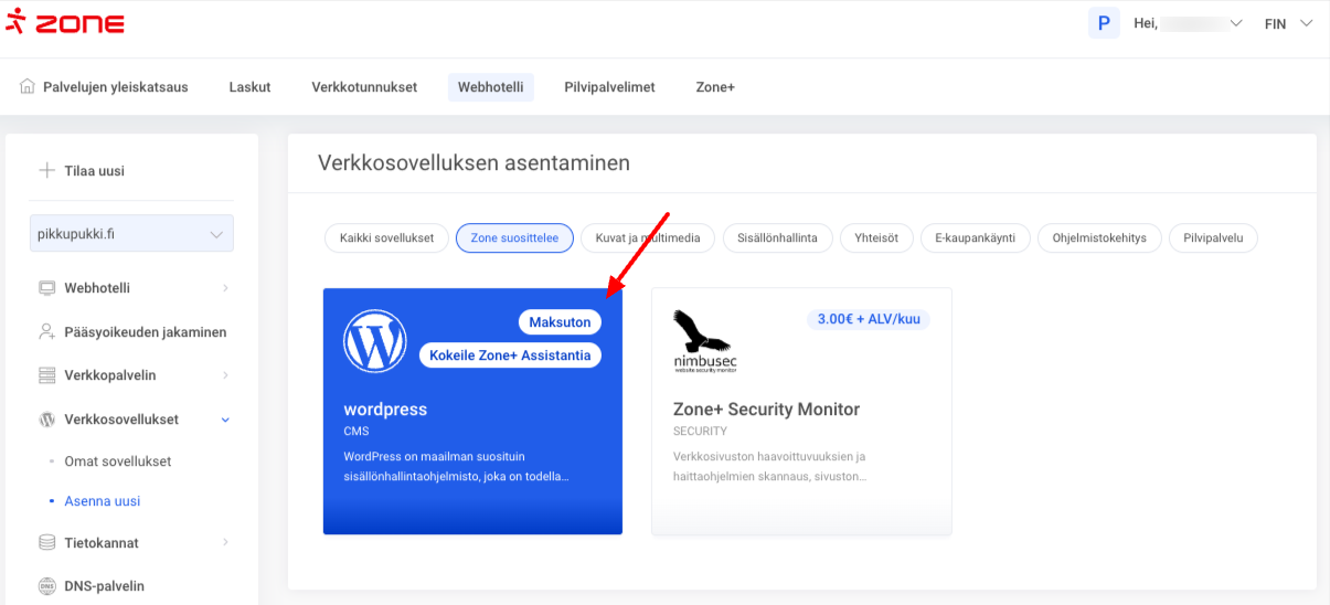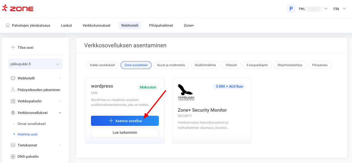 • Voit asentaa uuden WordPress-sovelluksen Zone+-sovellusten hallinnan kautta.